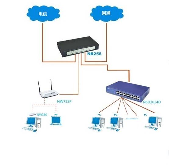 1、采用两条ADSL线路接入,实现带宽的叠加,满足20-30个人的带宽要求,NR256业内优秀的路由算法可以把带宽损耗降到最低,避免了单线拉光纤的高投入;