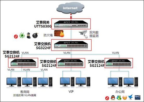 艾泰网关UTT5830G酒店局域网划分为客房、VIP、办公等区域,须通过交换机VLAN功能实现三个区域两两之间隔离,相互访问。