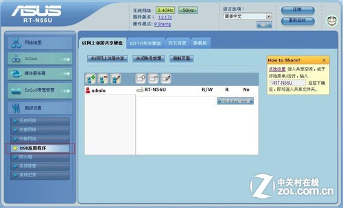 在USB应用程序设置选项中,用户可以对实用的双USB接口进行相关设置,其中包括以网上邻居共享硬盘、以FTP共享硬盘、其他设置和数据机设置。其中在以FTP共享硬盘设置中,用户可以FTP功能、添加帐号、修改账号等。