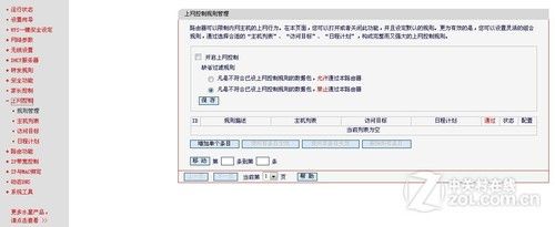 路由器可以内网主机的上网行为,在上网控制页面,您可以打开或者关闭此功能,并且设定默认的规则。更为有效的是,您可以设置灵活的组合规则,通过选择合适的“主机列表”、“访问目标”、“日程计划”,构成完整而又强大的上网控制规则。