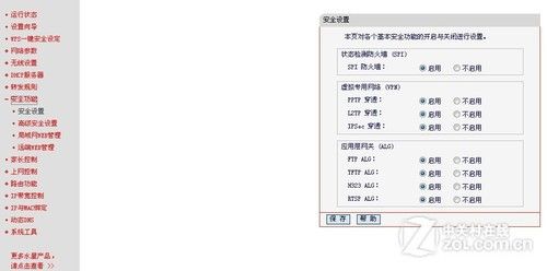 在安全功能选项中,我们可以进行基本的安全设置,包括或关闭防火墙、设置VPN以及设置应用层网关选项;接下来还有高级安全设置、局域网WEB管理和远端WEB管理选项可以设置。安全方面,水星MW330R绝对是有的。