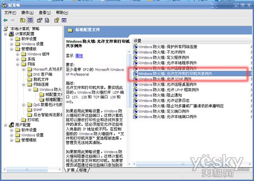 其次在该组策略编辑界面的左侧显示区域,用鼠标逐一展开“计算机配置”、“管理模板”、“网络”、“网络连接”、“标准配置文件”项目,在“标准配置文件”项目所对应的右侧显示区域区域中,用鼠标双击“Windows防火墙:允许文件和打印机共享例外”选项,打开该选项的属性设置窗口,选中其中的“已禁用”项目,再单击“确定”按钮,如此一来其他用户就不能在防火墙设置页面中随意排除“文件和打印打印机共享机共享”功能了,那样的话防火墙就能真正实现有效共享打印机安全的目的了。