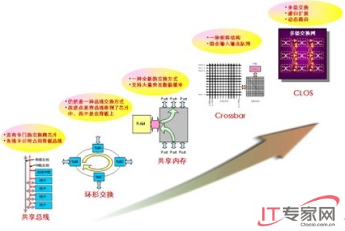 数据在路由器内部跨端口、跨单板之间的处理,即是交换。交换架构是路由器设备的核心,决定了一台设备的容量、性能、扩展性以及QoS等诸多关键属性。在历史上先后出现五种交换架构,包括:共享总线交换、环型总线交换、共享内存交换、Crossbar矩阵交换和基于动态路由的CLOS多级交换。