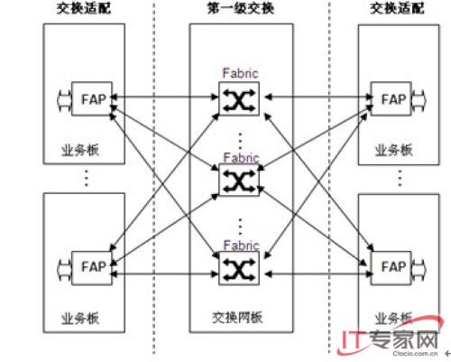 如图2所示,CR16000单框采用的是多级CLOS架构中的第一级交换,由一级交换网Fabric和交换网适配器FAP组成,后续可以通过递归扩展交换网至,支持集群功能;CR16000采用的网板设计,和主控板物理分离,交换和路由完全物理分离,互不影响,提高系统可靠性。一台CR16000有多个交换网板,每个交换网板有1~2个交换网片Fabric,通过多个交换网片Fabric负荷分担支持40G/100G高速端换,其主要功能包括:控制信元交换、数据信元交换和路由处理;在每个业务板设计了交换网适配器FAP(FabricAdapterProcessor),FAP在交换网和业务处理芯片(ASIC/NP)之间担当转换器的角色,其主要功能包括:VoQ和Buffer、报文和信元之间的切分和组装、交换调度等。