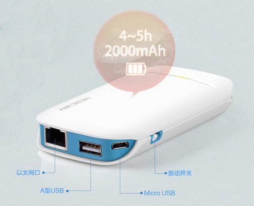 水星M301内置2000mAh锂电池,可持续工作4-5小时,为平板电脑、智能手机、笔记本等设备持久供电,还提供一个以太网口、A型标准USB接口和MicroUSB接口,整机依然小巧便携。