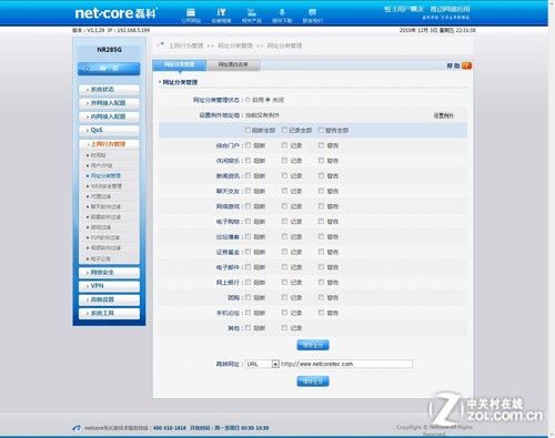 点击上网行为管理按钮,出现的是上网行为管理中最常见的网址分类管理界面,我们可以看到,网址分类非常的详细。而除了这一项设置外,用户还可以进行时间段、用户/IP组、WEB安全管理、代理过滤、聊天软件过滤、股票软件过滤、游戏过滤、P2P软件过滤和视频软件过滤等操作,内容相当的全面。