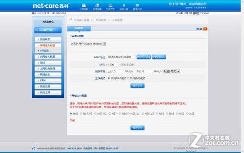 点击NR285GWeb设置首页中的WAN口按钮,左侧菜单栏中的“外网接入配置”界面便会自动弹出。在这里,用户可以自己选择网络接入方式、设置网络带宽、选择工作模式等,用户甚至还可以进行网络尖兵配置,设置内容相当丰富。