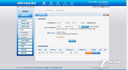点击QoS按钮,我们即可进入QoS设置界面,该界面包括三个子菜单——主机带宽控制、主机带宽和应用优先级。用户通过精细的带宽管理设置,可有效防止内网用户过度使用有限的网络带宽资源,关键业务的带宽需求。