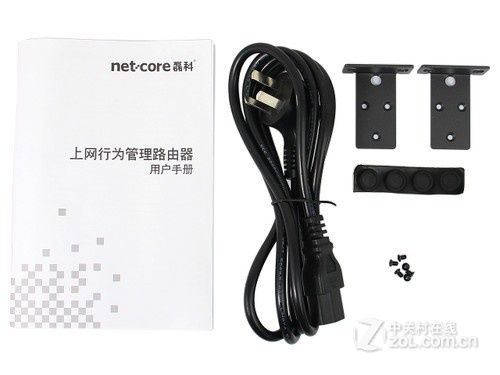磊科NR285G的随机配件相当简洁,仅有一根电源线、一本用户手册和一对安装在机架上必备的耳片。