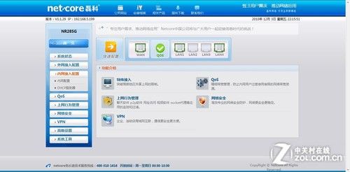 进入NR285G的Web界面,展现在我们面前的是一个清新、美观、易用的Web设置首页界面。而除了醒目的快速设置按钮外,包括WAN口、LAN口、QoS、上网行为管理等常用的功能也已实现“按钮”化,更加的直观易用,由此可见磊科的用心。