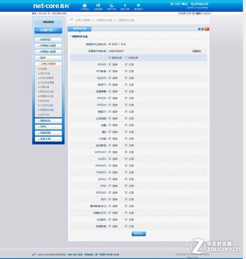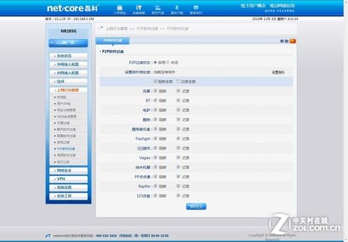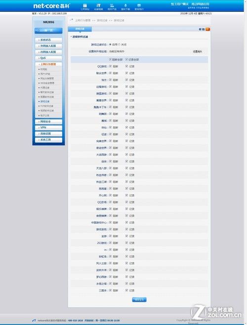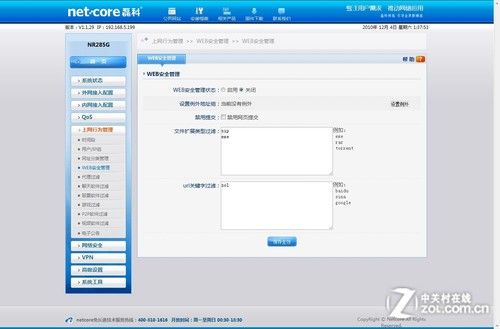 通过WEB安全管理,用户可以实现文件扩展类型和URL关键字过滤,我们分别设置了压缩文件(zip)、可执行文件(exe)和zol关键字的过滤。测试内容为打开zol首页及频道页;下载最新的qq安装文件和浩方对战平台压缩文件,一起来看看测试结果: