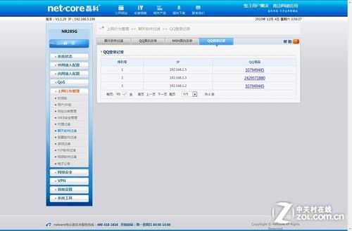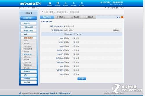 在聊天软件过滤设置中,NR285G还为企业管理员提供了一项“特殊”服务,即可查看内网所有登录的QQ号,谁在工作时间聊天一目了然。而更加神奇的是,管理员只需点击界面中的QQ号,即可与其直接交流,非常的方便实用。