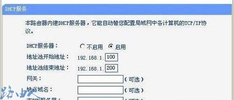 (2)在由器管理界面单击左侧的“DHCP服务器”选项,在弹出的“DHCP设置”窗口中,单击“启用”按钮。“地址池开始地址”和“地址池结束地址”选项IP地址的第4段是用户可以任意输入的部分。我们可以分别输入100、200(需要注意的是输入的开始地址必需小于结束地址,而且开始地址不能是0、1,结束地址不能是255);
